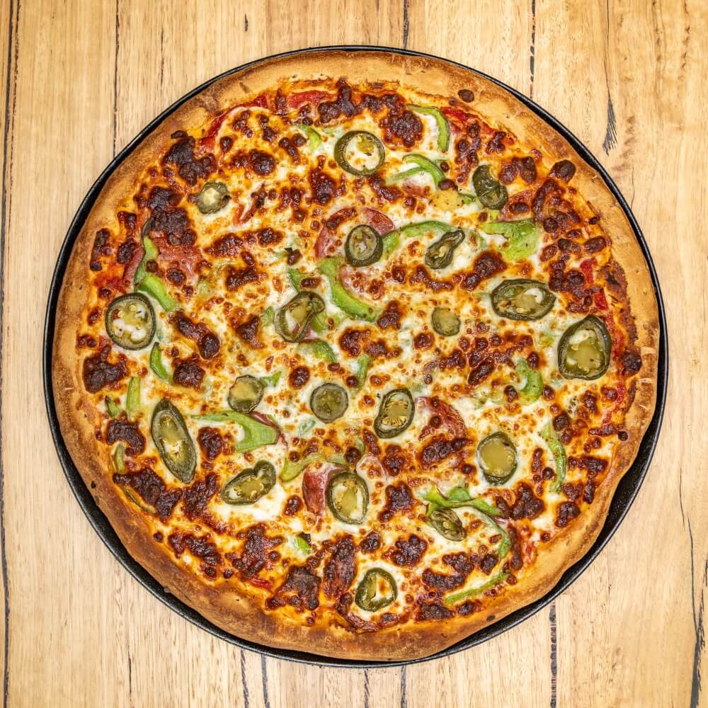 Tomato base, cheese, capsicum, salami, jalapenos, chilli, crushed garlic