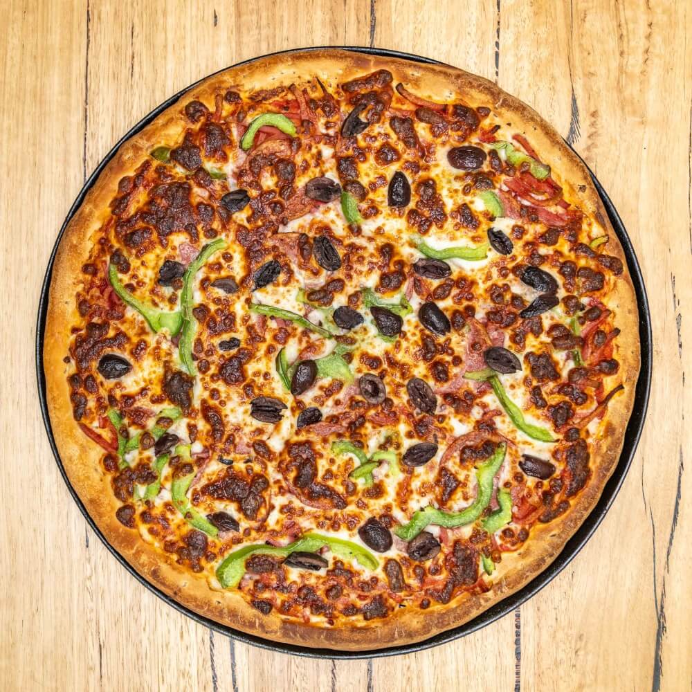 Tomato base, ham, capsicum, salami, olives, cheese