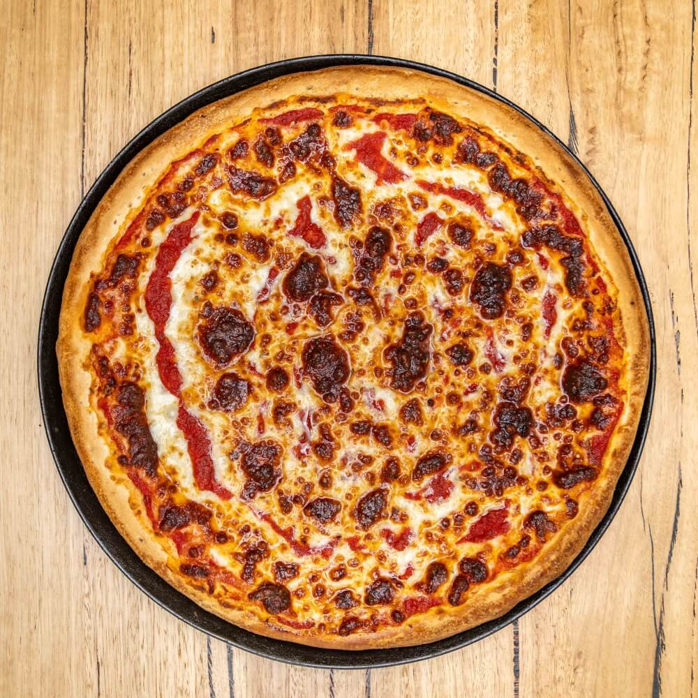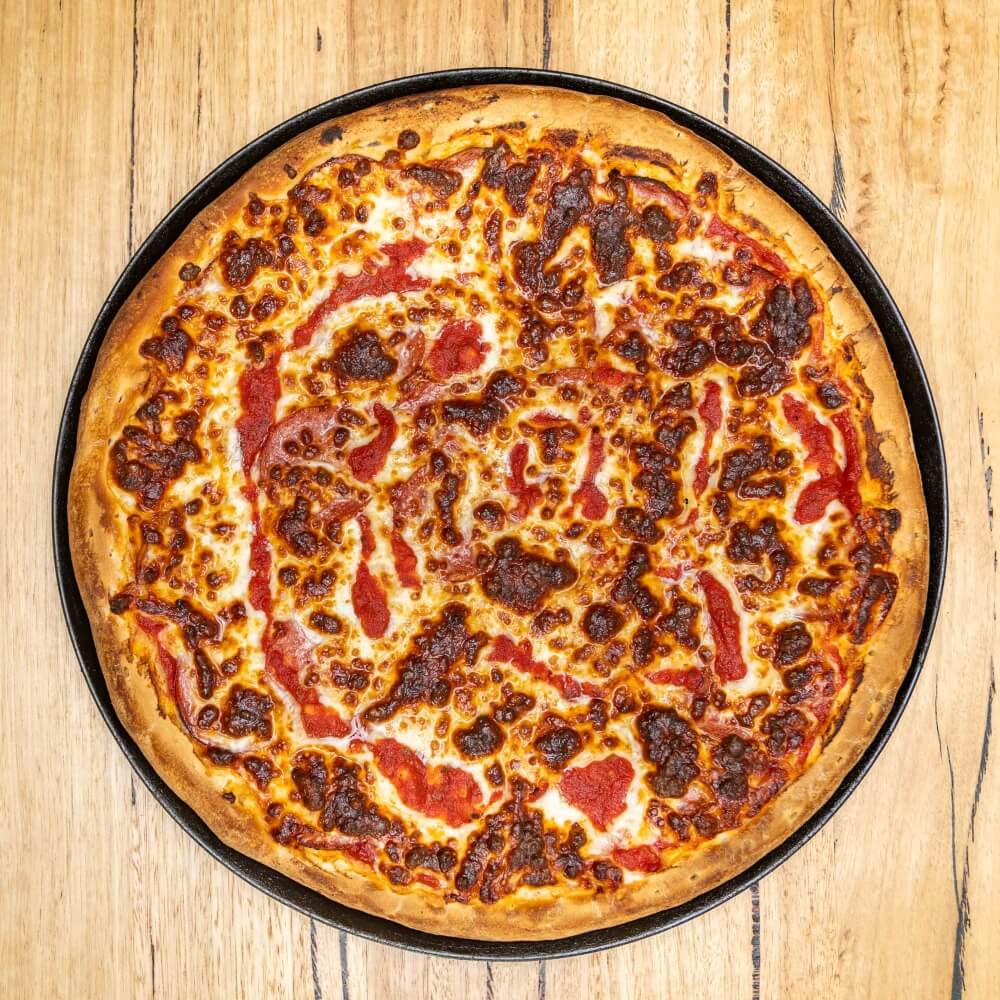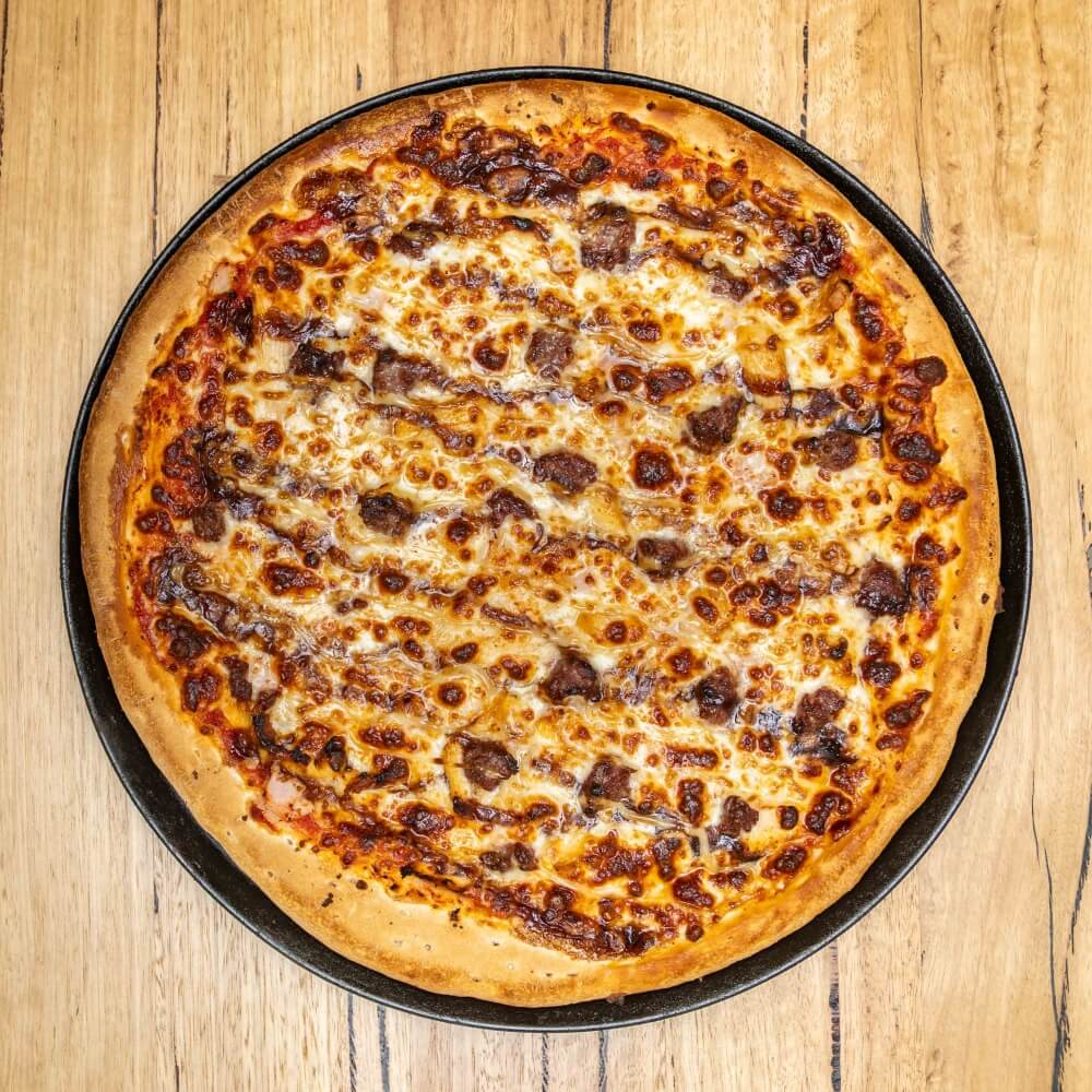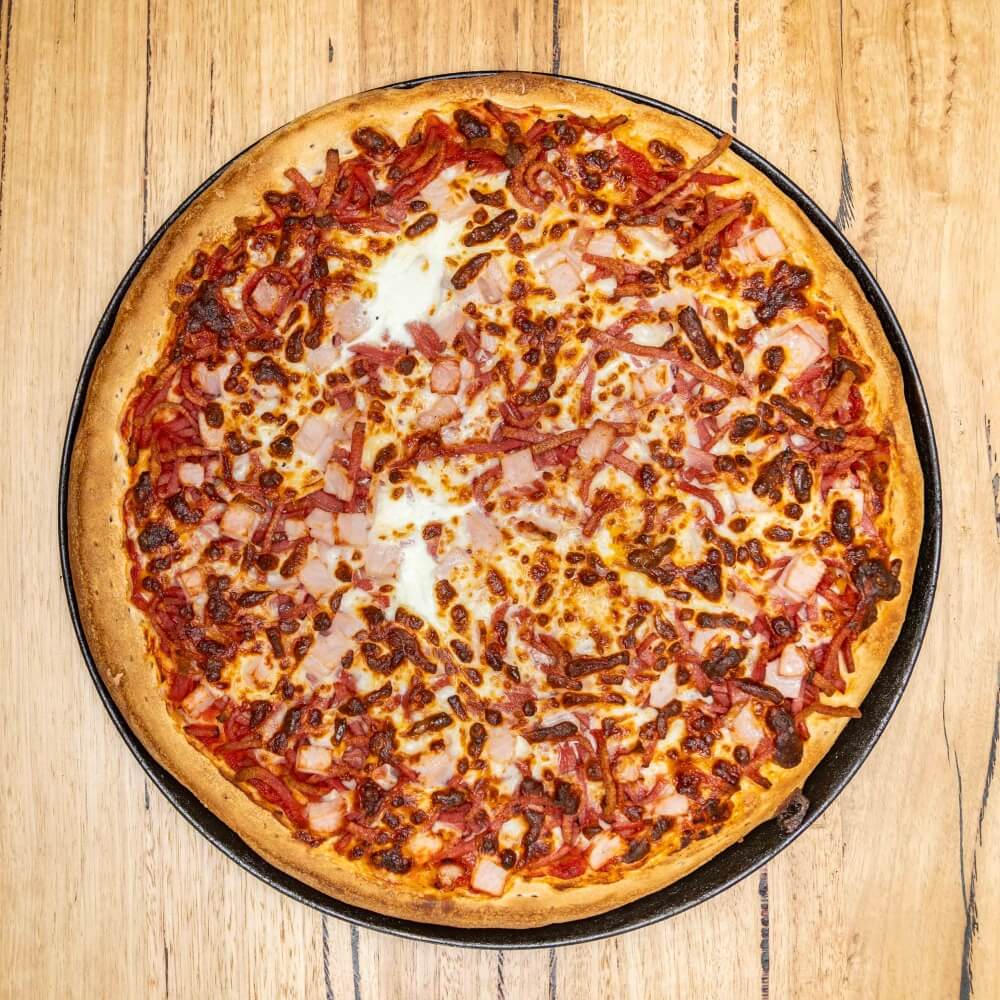 Tomato base, ham, bacon, salami, beef, chicken, cheese, BBQ sauce