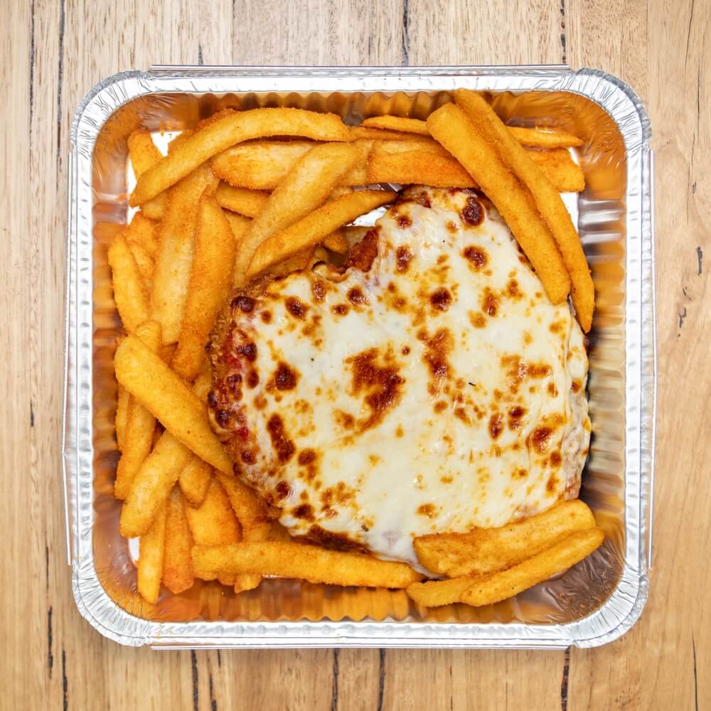300G panko crumbed chicken schnitzel, Napoli Sauce, cheese & beer battered chips