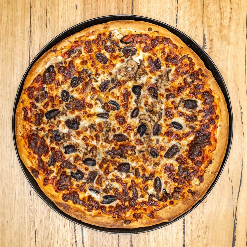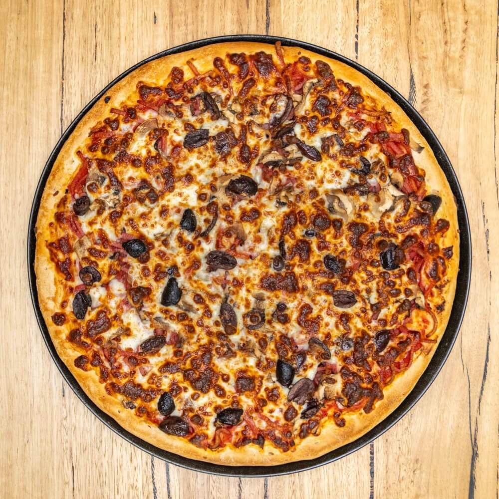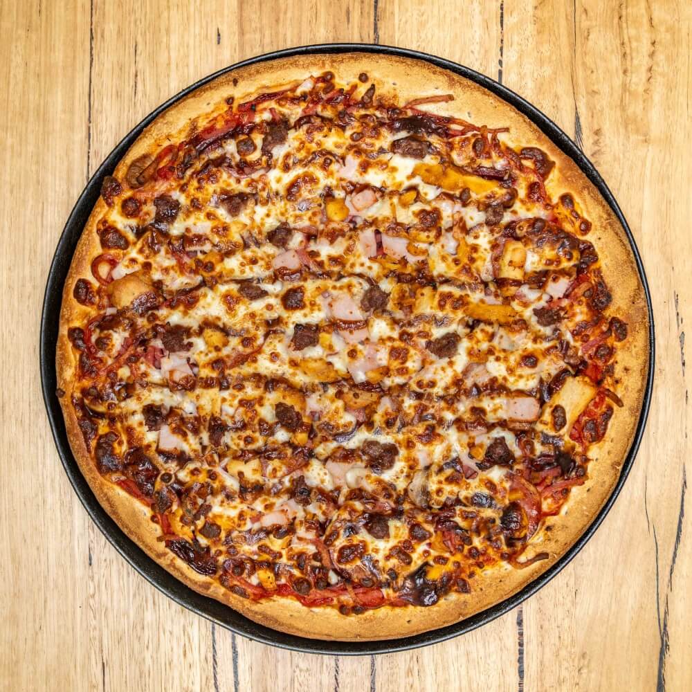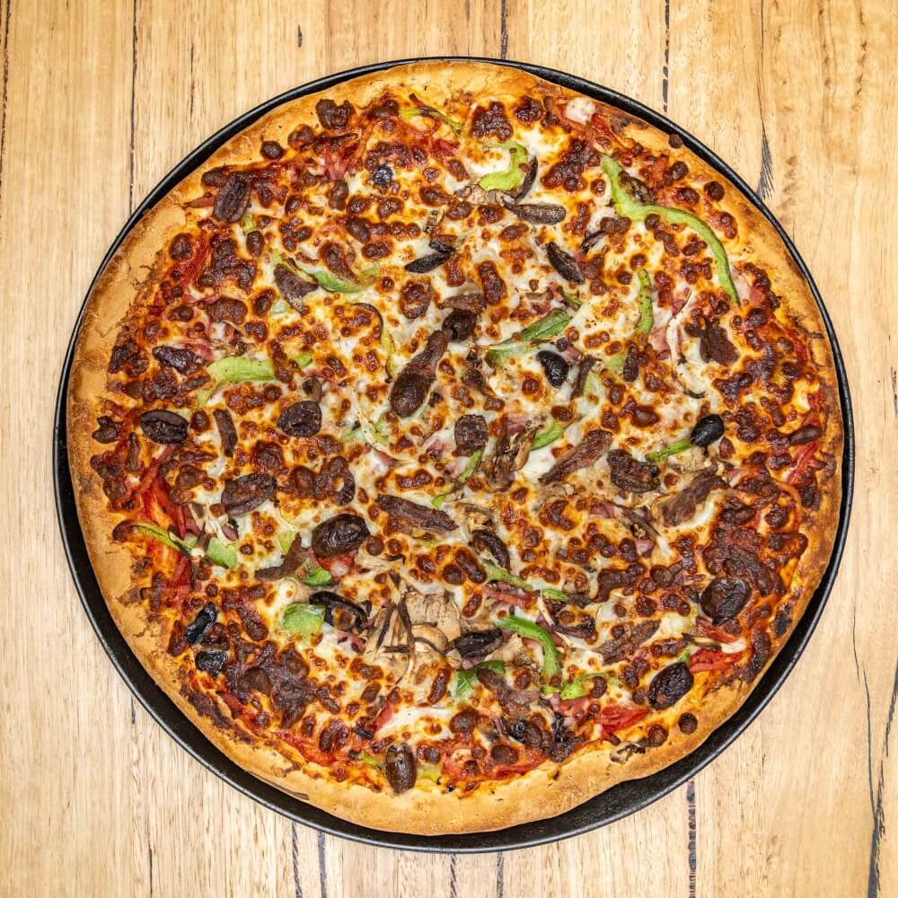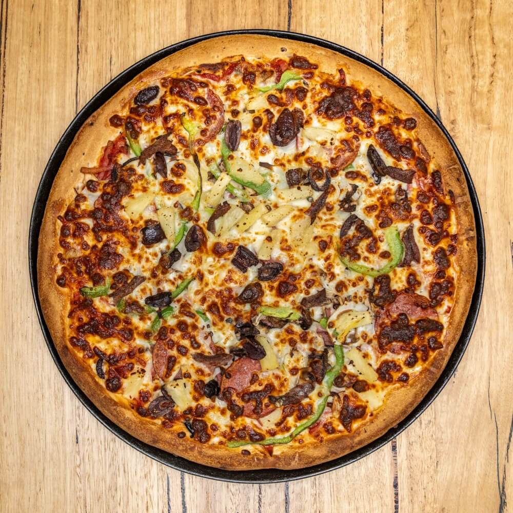 Tomato base, ham, onion, capsicum, mushroom, olives, salami, pineapple, anchovies, cheese