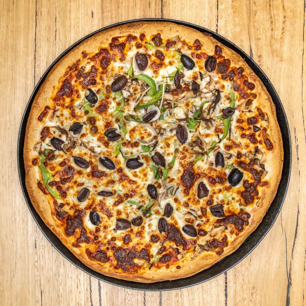 Tomato base, onion, capsicum, mushroom, olives, cheese